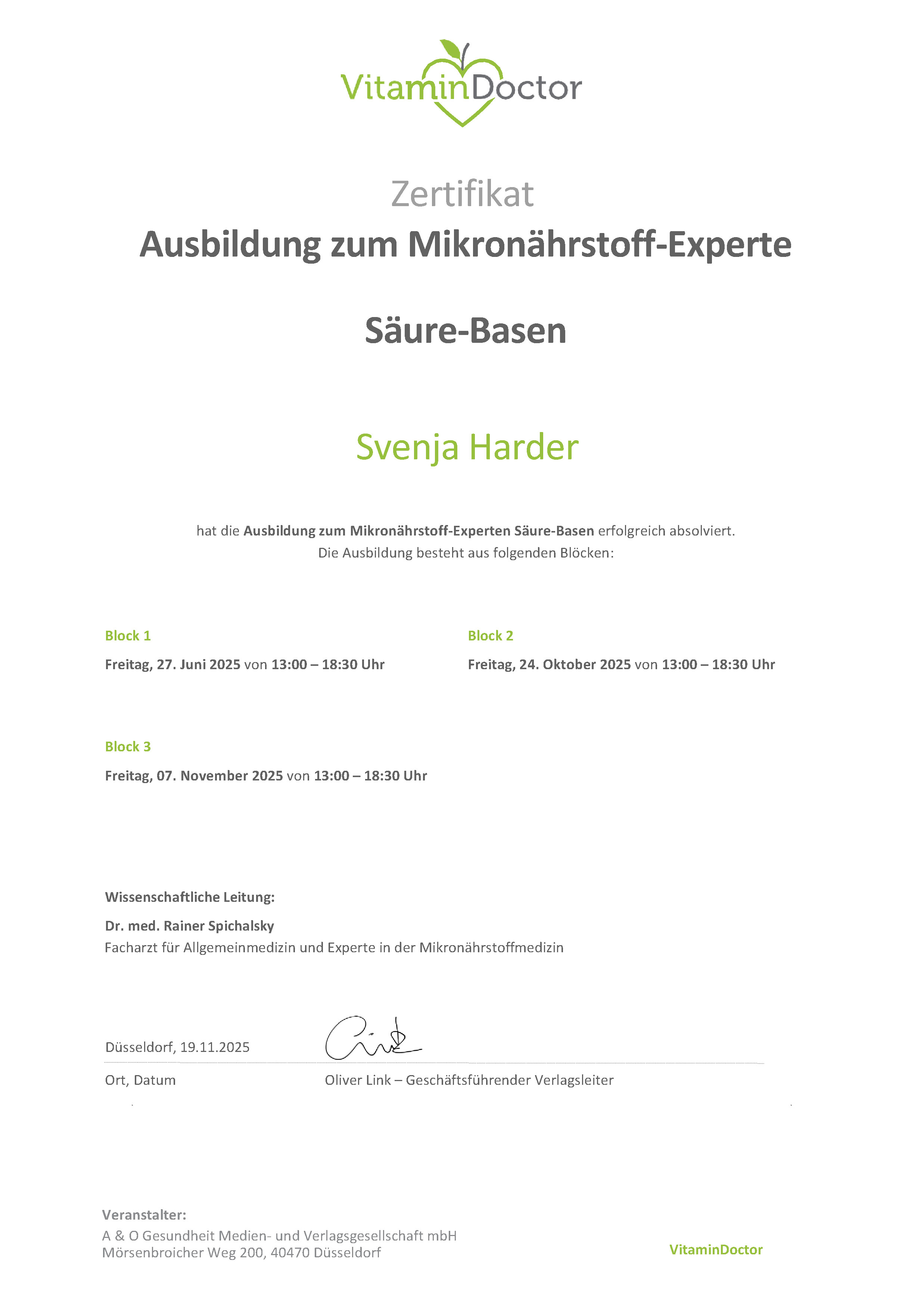 Ein besonderer Schwerpunkt meiner Arbeit liegt auf der laborgestützten Mikronährstoffberatung sowie der HPU-Beratung. Prävention spielt dabei eine zentrale Rolle: Ursachen frühzeitig erkennen, Zusammenhänge verstehen und individuell gezielt unterstützen. Ich begleite dich auf deinem persönlichen Weg zu mehr Gesundheit, Vitalität und Lebensqualität. Ich freue mich darauf, dich bei einem ersten Gespräch kennenzulernen.