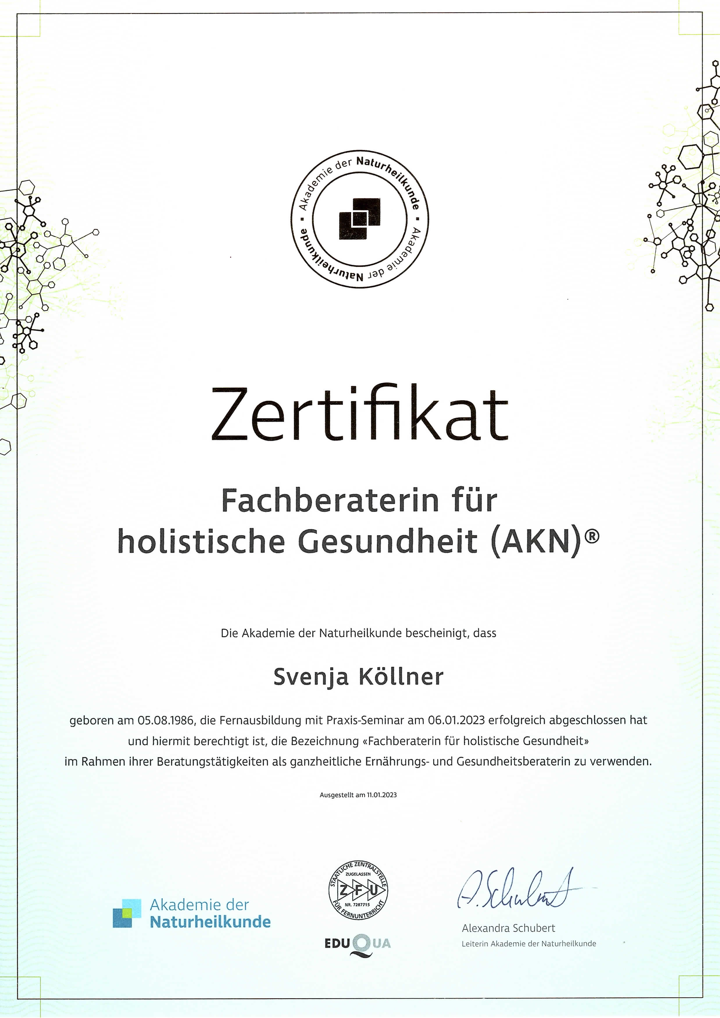 Hey, ich bin Svenja, Fachberaterin für holistische Gesundheit (ganzheitliche Ernährungs- und Gesundheitsberaterin), zertifiziert durch die Akademie der Naturheilkunde (Schweiz) und HPUandYou-Coach.